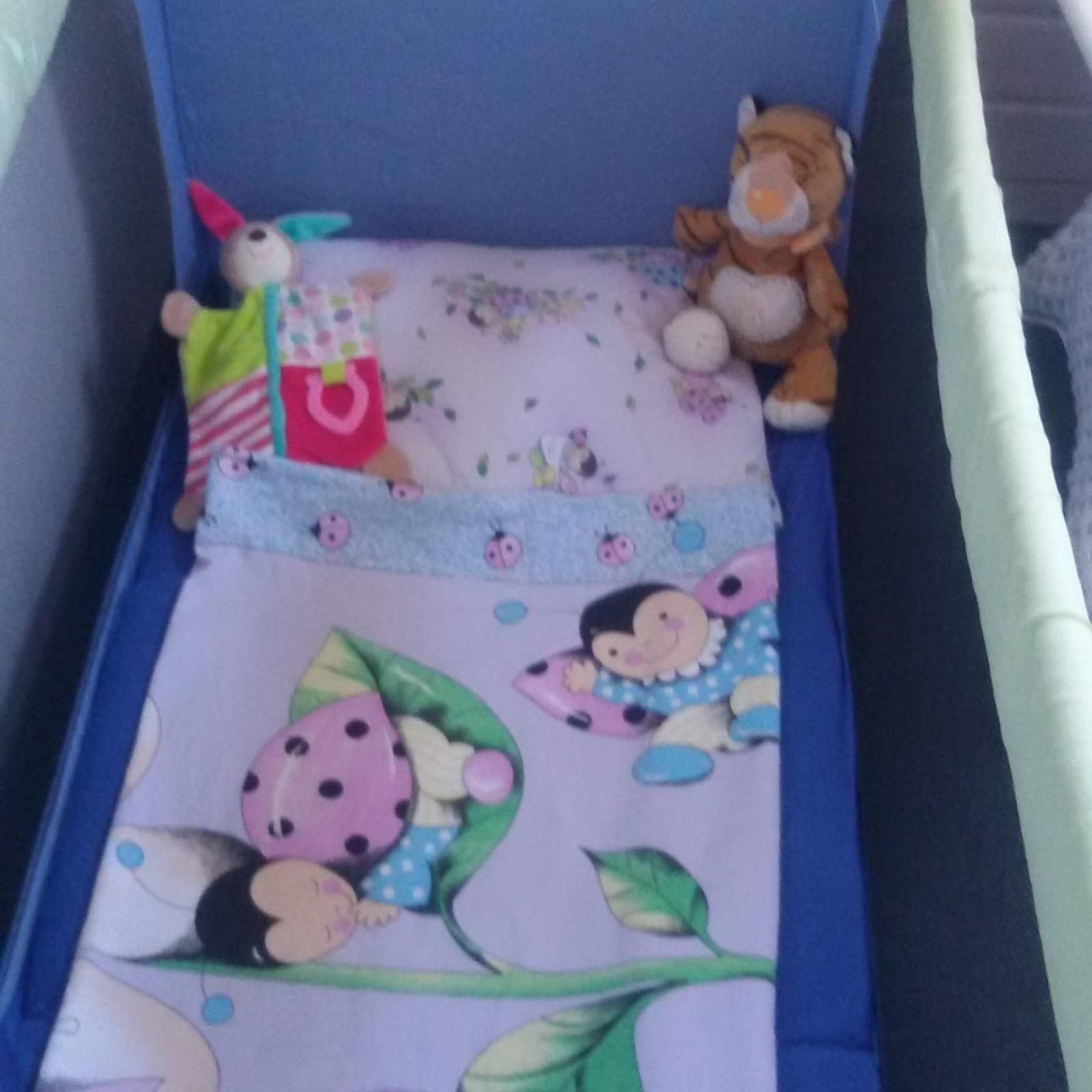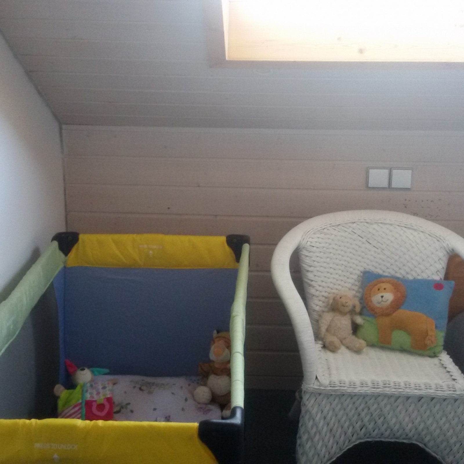 Das kleine Schlafzimmer der Kinder mit den Reisebetten mit Matratzen befindet sich im Obergeschoss. Das Treppensteigen will ja auch gelernt sein! Ohne Begleitung allerdings, dürfen die Kinder die Treppe nach oben nicht benutzen. Während der Anfangszeit schläft das Kind meist in einem anderen Raum damit ich seinen Bedürfnissen besser begegnen kann.